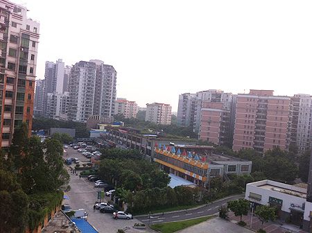 Sieht zwar nicht so prickelnd aus da unten, ist aber ziemlich cool. Abends tanzen die Muttis und Omis auf der Straße (ja, wörtlich), wir haben ein Café, einen Spa, eine Apotheke, mehrere Banken und einen Obstmarkt (und einen Kindergarten...) direkt vor der Tür, einen großen Supermarkt ca. 10 Minuten zu Fuß entfernt. Uni ist 10 Minuten zu Fuß plus 10 Minuten mit dem Bus entfernt, aber da der Bus nur 3 Yuan weniger kosten würde als das Taxi und wir leider faul sind und es uns so anpisst, dass es keine Busfahrpläne gibt sondern alle kommen und gehen wann es ihnen gerade passt, werden wir wohl eher seltener den Bus benutzen. ;)