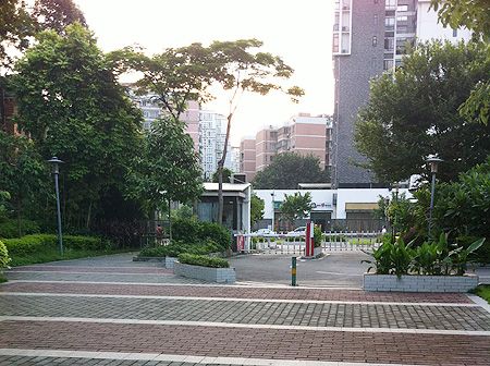 Das Eingangstor mit dem Security-Mann-Häuschen und der Zufahrt zur Apartment-Tiefgarage.