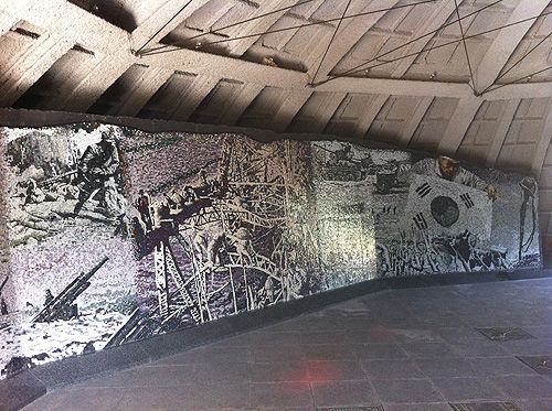 | Das Denkmal stellt einen ROK (Südkorea) Soldaten und seinen Bruder, der für die DPRK (Nordkorea) kämpft, dar, wie sie sich nach der Schlacht in die Arme fallen und sich gegenseitig vergeben. Der Riss in der Kuppel symbolisiert natürlich die Trennung der koreanischen Halbinsel. |