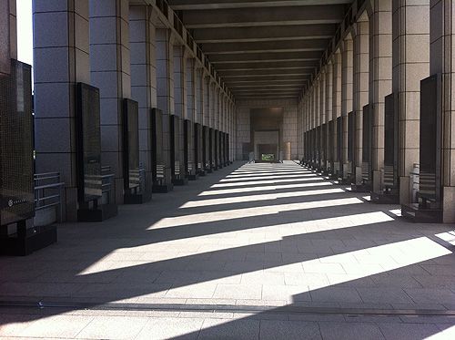 Das Gebäude hat an jeder Seite zwei solcher langen Gänge die mit Tafeln gesäumt sind. Außerdem führen noch zwei, jeweils etwas längere Gänge, von den Seiten zum Hauptgebäude. Das sind 6 Gänge voll mit Tafeln. Jede Tafel hat zwischen 80 und 112 Zeilen, in jeder Zeile stehen 15 Namen von Gefallenen. |