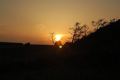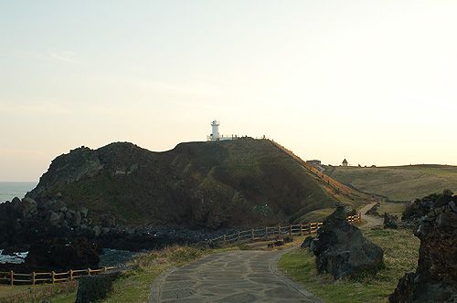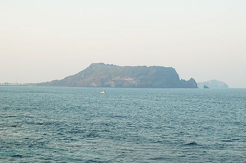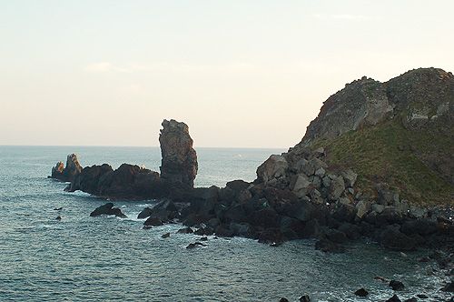 | Blick auf den Seongsan Sunrise Peak. Entstanden mitten im Meer in Folge mehrerer Vulkanausbrücke. Man kann hochklettern. Der Sonnenaufgang dort ist als einer der schönsten angesehen, daher der Name. |