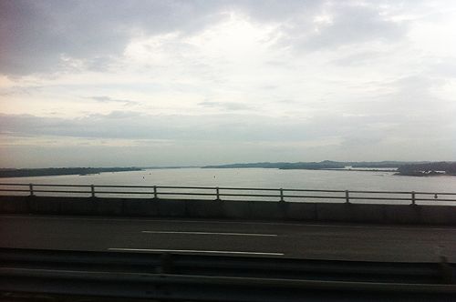 | Mit dem Bus nach Kuala Lumpur. Links ist schon Malaysia, rechts ist noch Singapur. |
